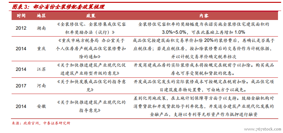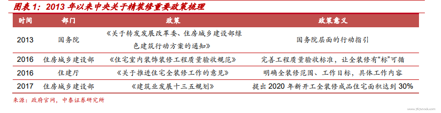 2013 年后,政策开始具体化、标准化、精确化。2013 年国务院发布《关于转发发展改革委、住房城乡建设部绿色建筑行动方案的通知》,指导住宅全装修推广工作的开展。2016 年住建部发布《住宅室内装饰装修工程质量验收规范》,通过建立国家行业标准,进一步完善全装修工程质量验收标准。同年,住建厅《关于推进住宅全装修工作的意见》提出了推进全装修的具体工作目标和内容。2017 年发布的《建筑业发展十三五规划》则明确提出了 2020 年全装修占比达到 30%的目标。