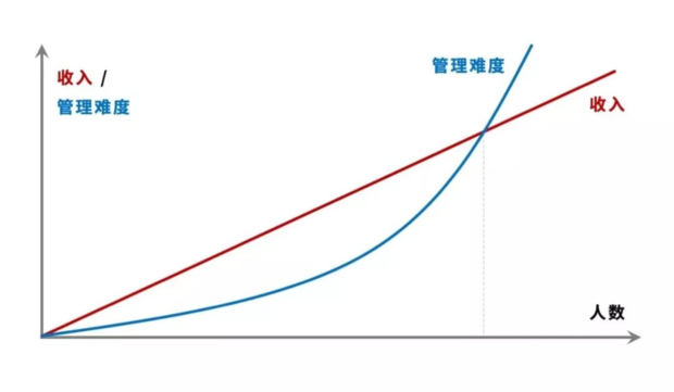 其实企业人数的增加,带来的收入增长,大致是呈线性的;而人数变多导致的管理复杂度上升,却是指数级的。
