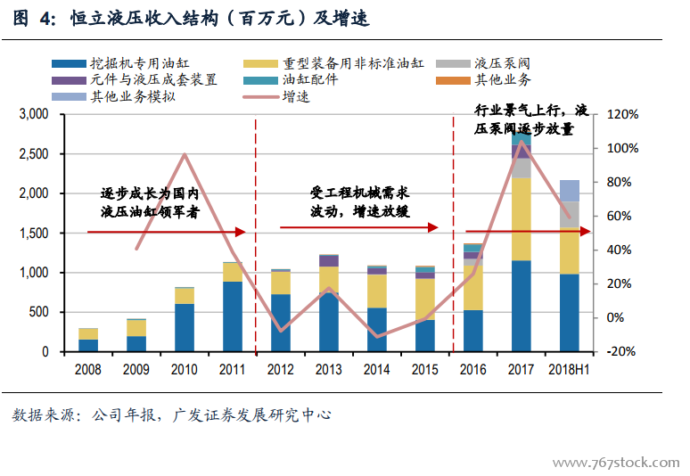 恒立液压在国内市场占有率已达较高水平,下游客户结构持续优化。如果按照一台挖掘机配置四个液压油缸来计算,公司的挖掘机油缸市场份额从2008年的13.7%上升至2018上半年的47.07%,提升超过33个百分点,并达到较高水平。液压元件及系统作为大型机械核心传动装置,下游应用领域广阔。从客户结构来看,公司客户包括工程机械的卡特彼勒、日本神钢、日立建机、三一重工、徐工机械,海工海事机械的振华重工、国民油井,地下掘进设备的中铁铁建、中铁装备等高端客户,以及以高空作业平台为代表的特种车辆。公司当前优质的客户资源,为未来市场份额的突破和持续的盈利打下良好基础。
