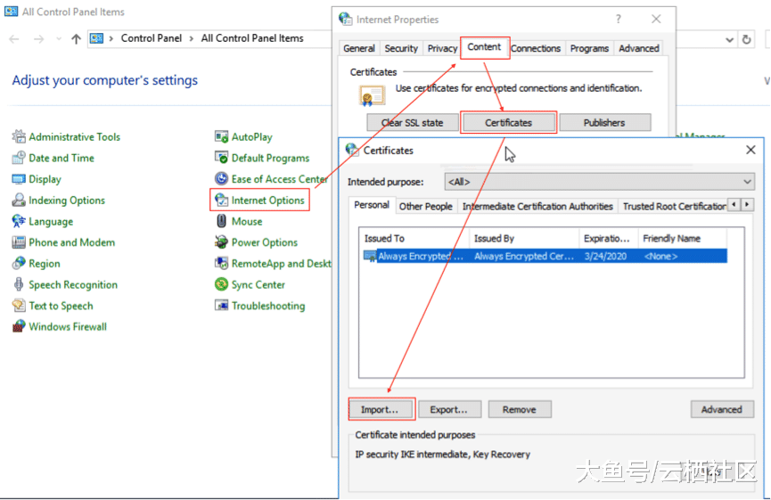 客户端导入证书方法与服务端证书导出方法入口是一致的,方法是:Control Panel –> Internet Options -> Content -> Certificates -> Import。如下截图所示: