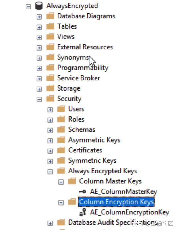 当然,您也可以使用SSMS的IDE来查看Column Master Key和Column Encryption Key,方法是:展开需要检查的数据库 -> Security -> Always Encrypted Keys -> 展开Column Master Keys和 Column Encryption Keys。如下图所示: