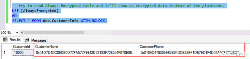 从应用程序的测试结果来看,我们可以正常读、写Always Encrypted测试表,应用程序工作良好。那么,假如我们抛开应用程序使用其它方式能否读写该测试表,看到又是什么样的数据结果呢?