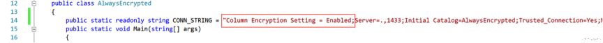 我们在应用程序代码中,仅需要在连接字符串中添加Column Encryption Setting = Enabled;属性配置,即可支持SQL Server 2016新特性Always Encrypted,非常简单。为了方便大家观察,我把这个属性配置放到了连接字符串的第一个位置,如下图所示:
