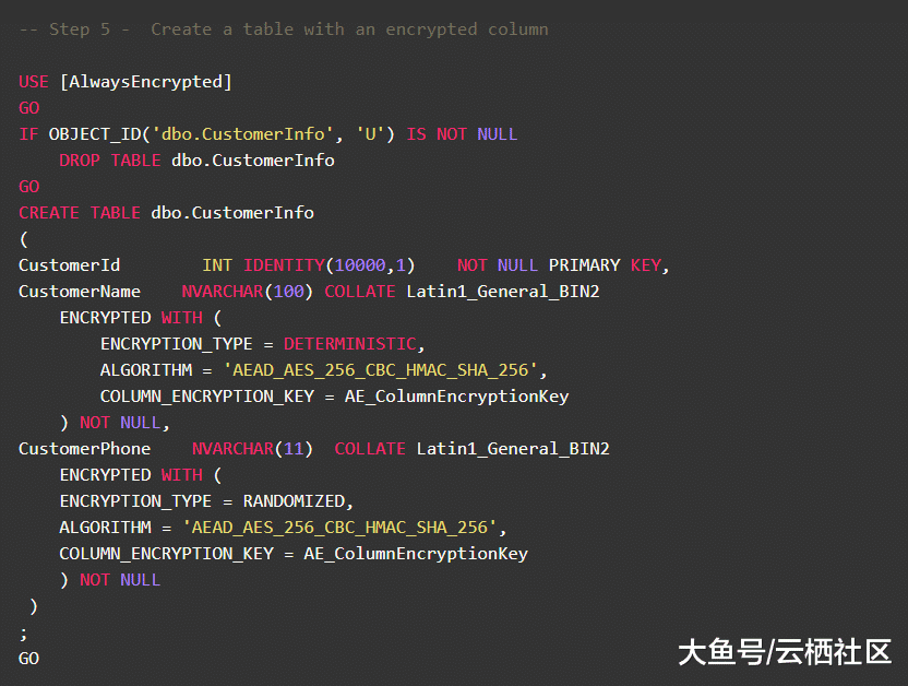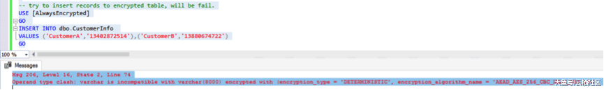 下一步,我们创建Always Encrypted测试表,代码如下: