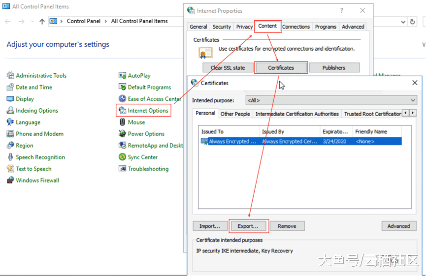 最后,我们将服务端的证书导出成文件,方法如下:Control Panel –> Internet Options -> Content -> Certificates -> Export。如下图所示: