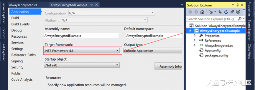 我们使用VS创建一个C#的Console Application做为测试应用程序,使用NuGet Package功能安装Dapper,做为我们SQL Server数据库操作的工具。注意:仅.NET 4.6及以上版本支持Always Encrypted特性的SQL Server driver,因此,请确保您的项目Target framework至少是.NET 4.6版本,方法如下:右键点击您的项目 -> Properties -> 在Application中,切换你的Target framework为.NET Framework 4.6。