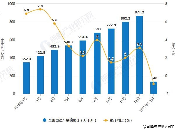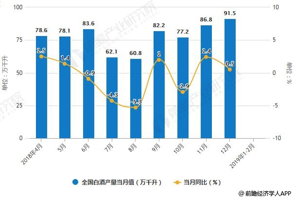进入2019年,据前瞻产业研究院发布的《中国白酒行业市场需求与投资战略规划分析报告》统计数据显示,2018年1-3季度全国白酒产量呈下降趋势,下降幅度有所减缓。2018年4季度全国白酒产量有所增长。2018年12月全国白酒产量为91.5万千升,同比增长0.5%。2018年1-12月全国白酒产量为871.2万千升,同比增长3.1%。2019年1-2月全国白酒产量为140万千升,同比下降0.9%。