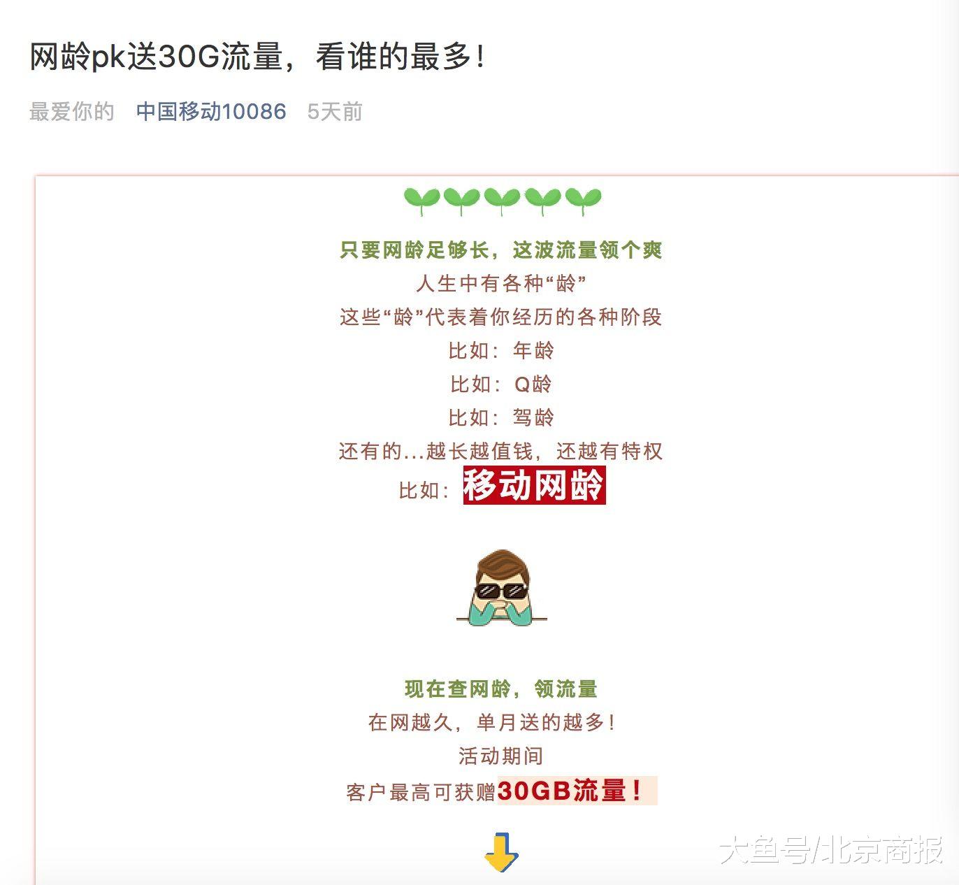 北京商报记者发现,这次的活动可谓火爆异常,收获了不少热度。中国电信也不甘示弱,同时正式推出查网龄赠好礼的活动。根据活动介绍,参与时间为2019年4月28日——2019年12月31日,仅限指定的电信互联网卡套餐领取,根据不同网龄,用户会获得爱奇艺、优酷会员、100元京东券、话费、流量等多种不同的福利。