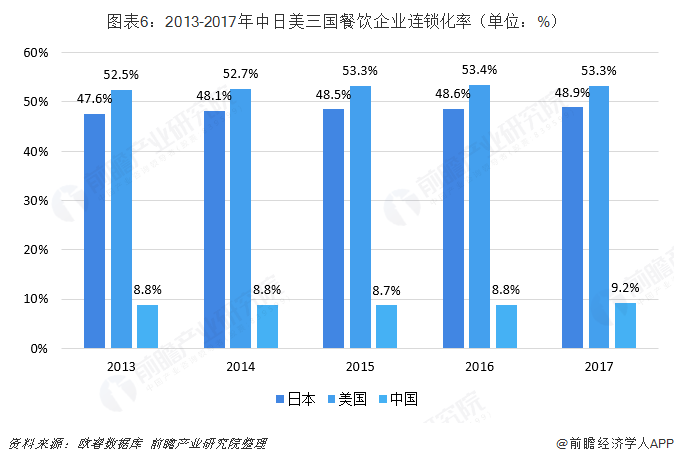 行业整体增速趋缓,行业内部进入洗牌时期。2013年起,连锁餐饮企业营收增速超越餐饮企业整体营收增速,整体连锁化率进入提升区间。2017年,餐饮门店数量超过500万家(供给数量是酒店业的10倍以上),连锁化率仅为9.2%,远低于美国及日本。大部分的中式餐饮企业都存在扩张困境,首先是对厨师依赖程度高导致门店复制的困难(部分品类餐饮可通过标准化解决),其次是口味上在异地扩张方面存在天然难度,最后是门店数量到达一定规模后出现的管理困难。