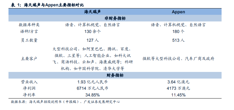 海天瑞声,覆盖语音、视觉等领域的数据服务;阿里巴巴、腾讯的互联网公司为主要客户。公司成立于2005年,致力于为人工智能全产业链中的企业及科研机构提供专业的工程化数据资源产品和服务。公司业务涵盖智能语音、计算机视觉、自然语言等AI核心领域,全面服务于人机交互、智能家居、智慧城市等多种创新应用场景。当前公司已经拥有超过 500 个自主知识产权可授权使用数据库,并向下游客户提供了累计2,000余个定制数据资源库及相关服务。这些产品和服务可支持超过130 余个语种和方言。