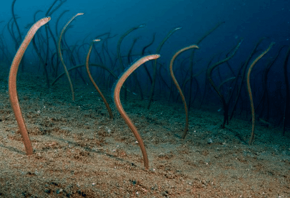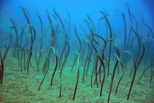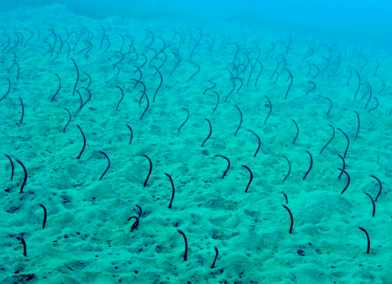 出水后,他立即向教练进行请教。原来这是一种名叫花园鳗的海洋动物。它是一种是群栖的动物,平常白天下半身埋在砂地,只露出上半身在水层中啄食浮游动物,这才有了海底壮观吓人的一幕。