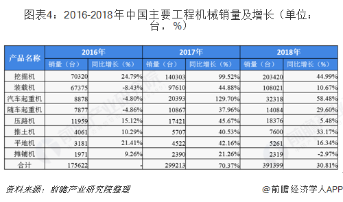 工程机械行业销量逐年上涨,2018年中国工程机械行业9种主要产品销售同比增长25.5%。其中挖掘机销售超过20万台,达到历史峰值,同比涨幅44.99%。装载机销售近11万台,增长超过10%。汽车起重机销售超过3万台,同比增长58.48%。合计产量超过39万台,同比增长30.81%。