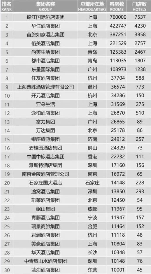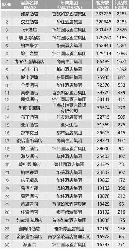 2019年中国连锁酒店集团规模TOP30统计情况