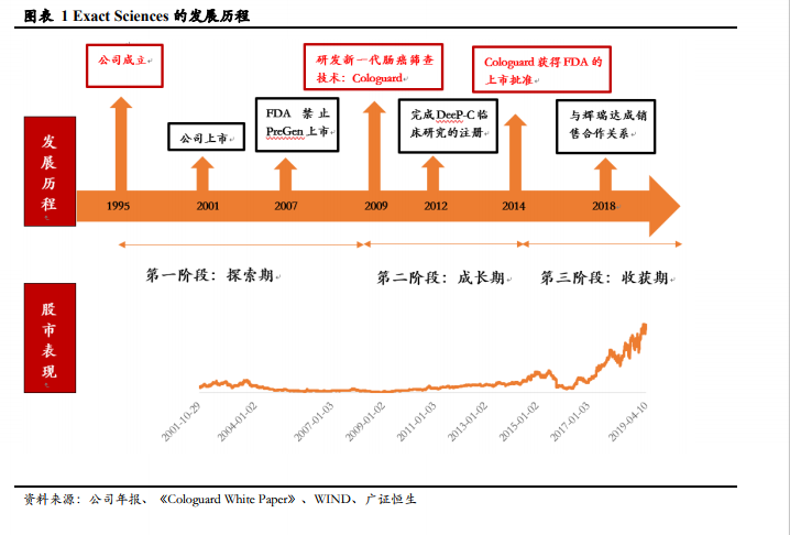 成长期:着手研发新一代 sDNA 肠癌筛查技术 Cologuard。PreGen-Plus 未获得 FDA 上市批准,Exact Sciences 选择重新研发新的基于 sDNA 的肠癌筛查技术。由于PreGen-Plus没有获得FDA 的上市批准,Exact Sciences与LabCorp的战略合作终止,这给Exact Sciences未来的销售收入带来了巨大的负面影响。为了公司的可持续发展,Exact Sciences 决定依据 FDA 对医疗器械的相关规定,研发能获得 FDA 上市批准的新一代的基于 sDNA 的肠癌筛查技术:Cologuard。为了 Cologuard 的顺利研发,Exact Sciences 与多方医药机构和企业达成战略合作关系,并重新组建管理团队。2009 年 1 月,Exact Sciences 与 Genzyme 达成战略合作关系,将适用于产前和生殖健康领域的部分知识产权转让给 Genzyme,并授权其在结直肠癌检测和肠道疾病的部分知识产权。2009 年 6 月 11 日,Exact Sciences 与梅奥医学教育研究基金会签订了专利授权协议,主要针对粪便或血液为基础的癌症诊断和筛查领域。2009 年 10月,Exact Sciences 与Hologic 签订技术许可协议。根据协议,Hologic 授予Exact Sciences在粪便领域的独家技术许可。2010 年 7 月,Exact Sciences 与 MDx Health S.A.签订技术许可和使用费协议,包括了结直肠癌粪便样本体外诊断检测和前期检测,DNA 甲基化生物标志物相关专利。