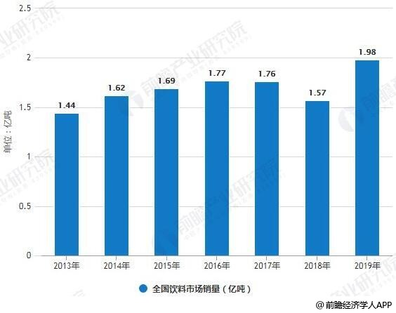 目前中国的饮料市场非常庞大,2017年全国包装饮料产量达18051.2万吨,累计增长4.6%。近年来同样保持增长,据前瞻产业研究院发布的《中国软饮料行业产销需求与投资预测分析报告》统计数据显示,2018年前11月全国饮料产量为14449.1万吨,同比增长5.8%。截止至2018年底,全国饮料产量为15679.2万吨,同比增长6.9%。预测2019年中国饮料市场将保持增长,产量将突破2亿吨,达到2.03亿吨。