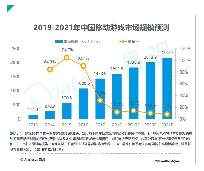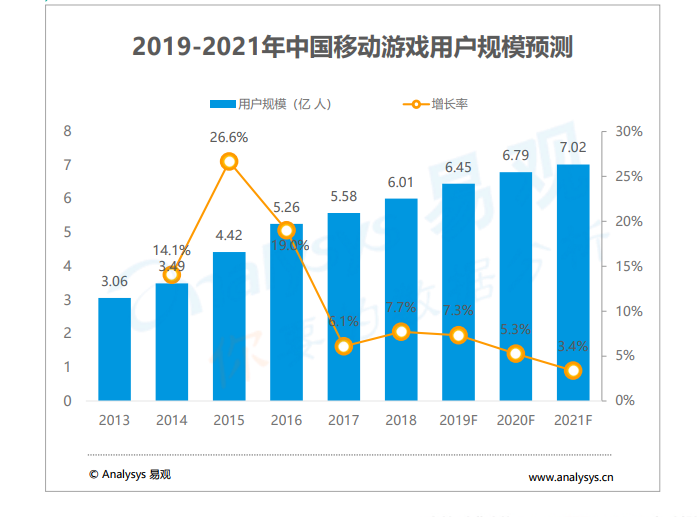 用户规模完全进入稳定增长阶段,已进入存量市场。Analysys易观数据显示,2018年中国移动游戏用户规模为6.01亿人,增长率为7.7%,预计20121年将达7.02亿人,增长率为3.4%。中国移动游戏用户规模的增长速度在2017年起就开始进入了稳定时期,移动游戏用户早期的大幅增长得益于移动互联网整体使用场景的多元化, 移动游戏的便捷性符合多元化场景的需求,且满足了移动游戏用户的碎片化时间。但是同时由于更多的文娱内容不断侵蚀用户的碎片化时间,而由于早期受计划生育政策影响而成长起来的新用户不断缩减,使得移动游戏用户已经步入了存量市场。