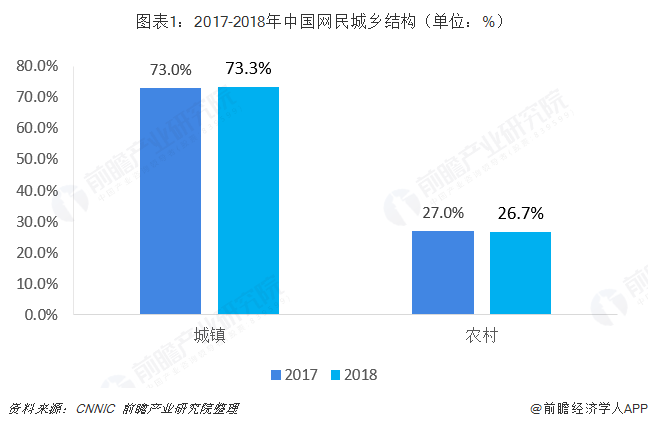 不过,由于我国不断推进城镇化进程,使得城镇人口不断增加,农村人口不断减少,城乡网民结构受此影响也发生了细微变化。2019年2月,第43次《中国互联网发展状况统计报告》显示,截至2018年12月,中国农村网民规模为2.22亿,占整体网民的26.7%,较2017年下滑0.3个百分点。但不可忽视的是,在数字经济时代,乡村振兴战略的实施面临互联网、大数据、人工智能和实体经济深度融合的经济环境。