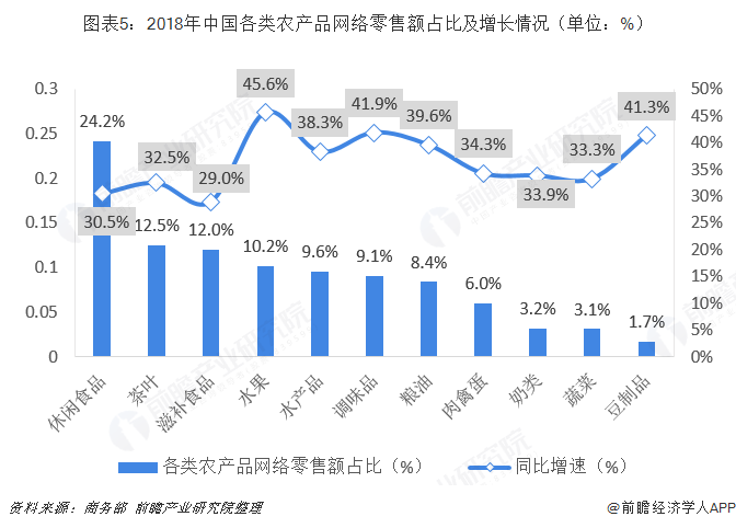农产品方面,2018年,全国农产品网络零售额达2305亿元,同比增长33.8%。其中,休闲食品、茶叶、滋补食品销售额排名前三,占比分别为24.2%、12.5%和12.0%;水果、调味品、豆制品等农产品同比增幅最快,分别为45.6%、41.9%和41.3%。