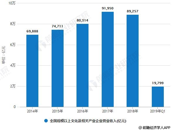 据前瞻产业研究院发布的《中国文化产业发展前景预测与产业链投资机会分析报告》统计数据显示,2017年全国规模以上文化及相关产业5.5万家企业实现营业收入实现营业收入91950亿元,比上年增长10.8%,增速提高3.3个百分点,继续保持较快增长。截止至2018年,全国规模以上文化及相关产业6万家企业实现营业收入89257亿元,按可比口径计算比上年增长8.2%。进入2019年一季度全国规模以上文化及相关产业企业实现营业收入19799亿元,比上年同期增长8.3%,比2018年全年加快0.1个百分点。