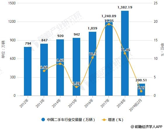 据前瞻产业研究院发布的《中国二手汽车行业市场需求预测与投资战略规划分析报告》统计数据显示,回看2017-2018这两年,在大力实施二手车限迁解禁背景下,二手车交易达到2012年以来活跃高峰期。2018年二手车成交量1382.19万辆,累计同比增长11.46%。但与新车销量比例约为1:2,远不及发达国家的二手车与新车销售2:1的比例,一方面是我国汽车在普及阶段,新车销量增长较快,另一方面则是因为二手车限迁导致流通受限。