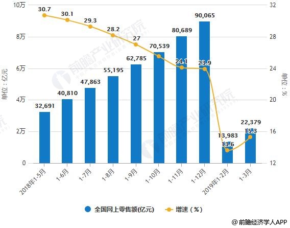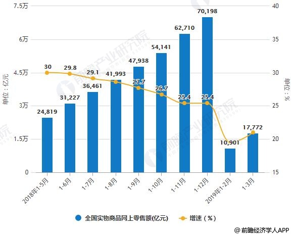 (备注:2018年1-8、2019年1-2月实物商品网上零售额增速分别为28.6%、19.5%)