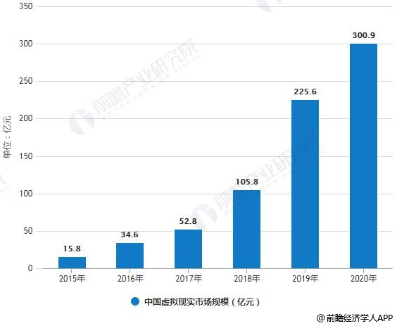 据前瞻产业研究院发布的《中国虚拟现实(VR)行业发展前景预测与投资战略规划分析报告》统计数据显示,2015年中国虚拟现实市场规模仅仅15.8亿元。之后呈现出高速增长态势。截止至2017年中国虚拟现实市场规模增长至52.8亿元。初步测算2018年中国虚拟现实市场规模将突破百亿元。预测2019年中国虚拟现实市场规模达225.6亿元,并预测在2020年中国虚拟现实市场规模将突破300亿元,达到300.9亿元。
