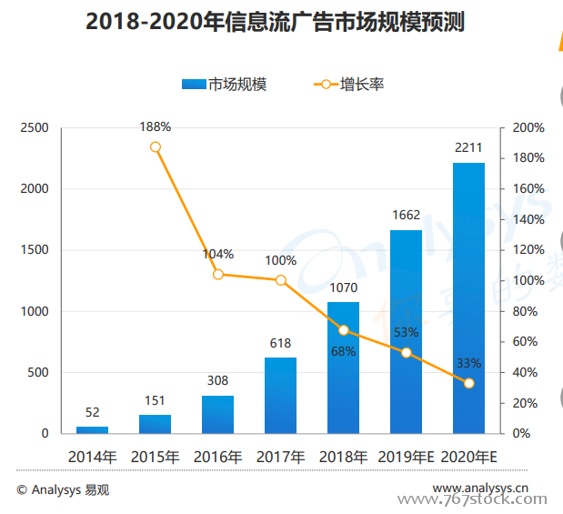 信息流广告市场发展迅速,市场规模持续增长。预计未来信息流广告市场规模将持续性增长,到2020年预计将达到2211亿元市场规模。市场驱动力,主要来自媒体方,头部媒体加大力度拓展信息流广告市场,广告呈现方式多样化、人群定向精准化,广告后台、广告资源的整合,投放方式、售卖方式的智能化都进一步推动行业的良性发展。广告主对于效果广告的需求旺盛,信息流广告的品效合一的特性受到广告主的青睐,在预算分配上开始独立设置广告预算。