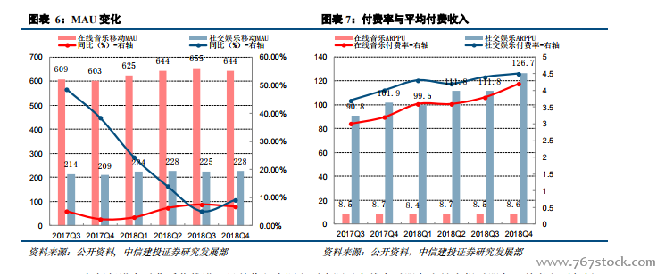腾讯音乐的经营数据分析。TME 背靠腾讯旗下社交两大社交平台(微信和 QQ)的庞大用户群,与控股股东腾讯具有明显的协同效应。截至 2018 年 6 月 30 日,TME 拥有最大的音乐内容库,包括来自 200 多个国内和国际音乐品牌的超过 2000 万首歌曲;TME 积极发展数据和技术支持,实现了依托客户群规模和参与度开发最符合用户偏好和增强用户体验的创新产品,着力打造多服务货币化格局,提升集团总收入。2018 年第二季度,QQ 音乐、酷狗音乐、酷我音乐和全民 K 歌四个主要产品品牌均成为中国四大音乐移动应用程序,总 MAU 超过 6 亿,且每个活跃用户平均每天花费时间超过 70 分钟。近一年来,TME 总 MAU 存在小幅上升趋势,同比增长率稍有下降,未来上升空间较小;用户平均付费收入基本持平,但付费率处于较低水平,虽有小幅波动但基本呈现上涨趋势。