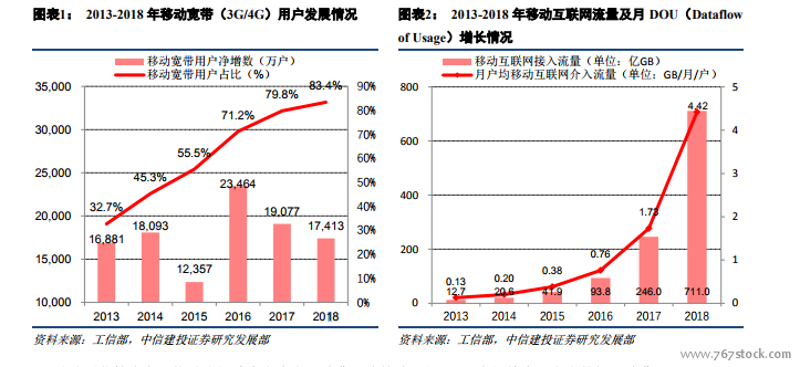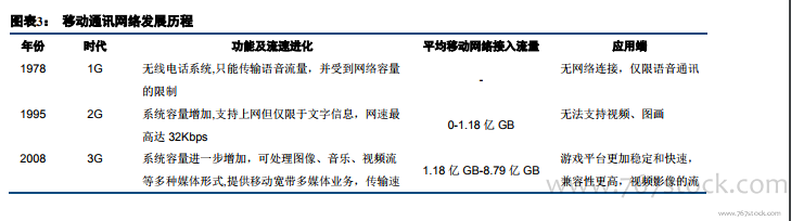移动通信技术发展推动应用端内容生产和消费形式持续更新,5G 有望催生更丰富的娱乐消费。1G 是一种仅限语音的蜂窝电话标准,使用范围小,风险性大且传输速度慢;2G 实现了无线数字通信,包括客户化应用移动网络增强逻辑,同时话音质量也得到了很大改进,但依然无法支持视频、图画;3G 相对于第二代移动通信传输速度有了很大提升,最快的速度可以达到 500kbps,流速的提升为图像、音乐、视频流等多种媒体形式的实现提供了可能,同时多媒体业务处理也使得流量体量暴发式增长到 2G 时代的 8 倍以上;4G 网络在 3G 基础上对WLAN 进行了融合,可以传输与电脑图像质量相当的视频,能够以 100Mbps 的速度进行下载,比家用的 4M 宽带快 25 倍,流量体量由于应用端高流量消耗的功能开启,较 3G 时增长近 100 余倍,短视频、移动视频直播应运而生;5G 时代更高的流速以及更大的流量将催生更高质量的超高清视频以及更低延时的云 VR/AR。