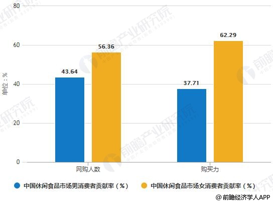 2018年中国休闲食品市场男女消费者贡献率统计情况