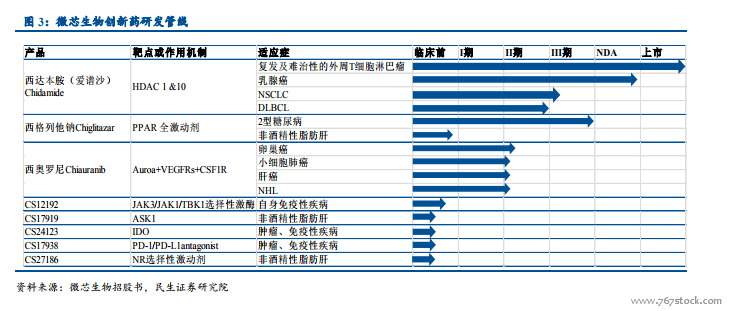 公司专注于原研创新药研究,拥有创新药物发现的核心竞争力平台。微芯生物 2010 年创立于深圳,专长于小分子药物的原创研发。公司自主创建了领先的“基于化学基因组学的集成式药物发现及早期评价平台”,作为原创新药研究的早期预测手段,以期有效降低原创新药研发的失败率。基于上述核心技术,公司成功发现并开发了包括西达本胺、西格列他钠、西奥罗尼在内的一系列新分子实体且作用机制新颖的原创新药,储备了 CS12192、CS17919、CS24123、CS17938、CS27186 等一系列新分子实体候选药物,产品梯队覆盖了不同疾病领域。