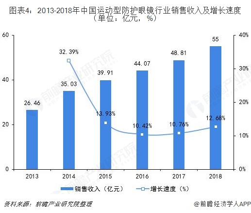 在我国居民可支配收入和人均消费支出不断增加以及国家大力推动全民健身发展的背景下,居民对健身运动的认可度和参与热情不断提升。同时,不断增加的滑雪以及运动骑行人数让运动眼镜有了较大的发展空间。从运动防护眼镜的国内市场规模看,2013-2018年,总体市场规模不断增加,至2018年运动防护眼镜的销售收入达到55亿元,较上年同比增加12.68%。