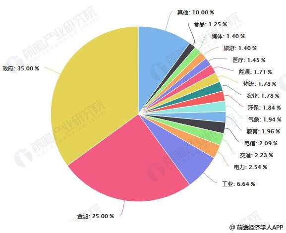目前,大数据在金融领域的应用最为广泛,处于领先地位,其他行业应用尚处于初级阶段。在未来,大数据应用将全面覆盖各个产业,应用技术和方法将会更加成熟,应用市场规模也将保持高速稳定的增长态势。预计2020年中国大数据应用最多的为政府,行业应用方面,金融大数据还将占据25%的份额,其次为工业大数据,预计占比6.64%。电力、交通、电信等其他领域也会不断加强大数据应用。