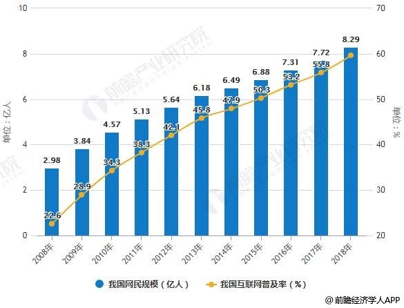 截至2018年12月,我国网民规模达8.29亿,普及率达59.6%,较2017年底提升3.8个百分点,全年新增网民5653万。我国手机网民规模达8.17亿,网民通过手机接入互联网的比例高达98.6%。