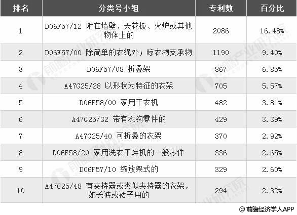 从技术分布来看,分类号小组中“D06F57/12 附在墙壁、天花板、火炉或其他物体上的”申请数量最多,达到2086件,占比16.48%;“D06F57/00 除简单的衣绳外;晾衣物支承物”专利申请数量也超过1100件,占比9.40%;“D06F57/08 折叠架”专利申请量排在第三。