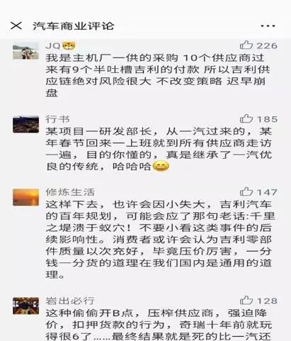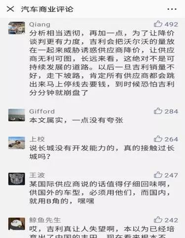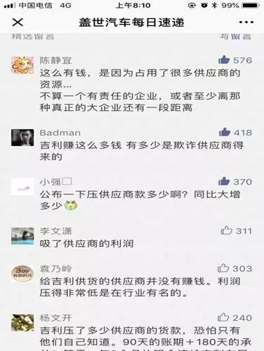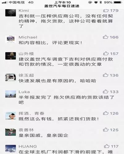 在去年吉利半年报发布的次日,以汽车零部件读者居多的盖世汽车网上,一篇《吉利发布上半年财报:净赚66.7亿元同比大增54%》的文章迅速成为10万+的爆文,本应该迎来读者们对自主品牌崛起的赞不绝口,然后评论中却是几乎清一色的对吉利压榨供应商的声讨,任何一条声讨吉利的评论都引来大量的点赞。