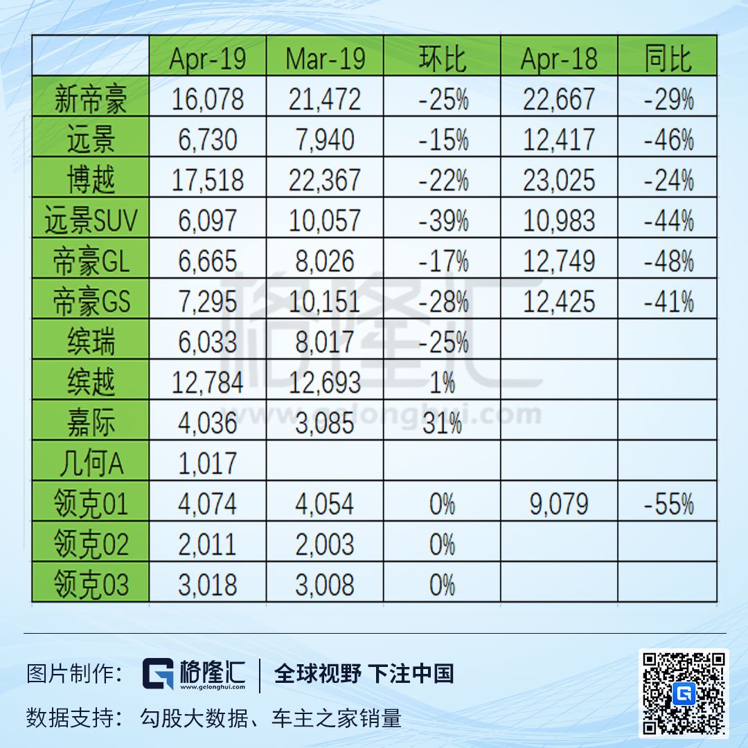 自主龙头19年交出的销量成绩单并不理想,前四个月只完成了全年目标的33%。从具体车型来看,吉利旗下的多个爆款车型热度也不如以往。除了新上市的几款车型之外,其余车型不管同比还是环比均出现较大幅度下滑。