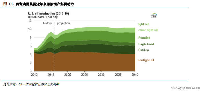 页岩油开采带来美国石油产量快速增长。伴随着美国页岩油水平钻井和水力压裂技术的突破,页岩油为代表的致密油产量出现大幅增长,2018 年美国原油总产量达到 1327 万桶/日,相对于 2008 年的产量低点基本上已经翻倍,其中根据 EIA 的估算,2018 年页岩油在美国原油产量中的占比已经达到 59%。近年来美国原油产量的增长主要来自于页岩油,页岩油已经成为美国原油增产的主要动力。与此同时,EIA 预测在未来 10 年中,美国页岩油产量将继续增长 600 万桶/日。
