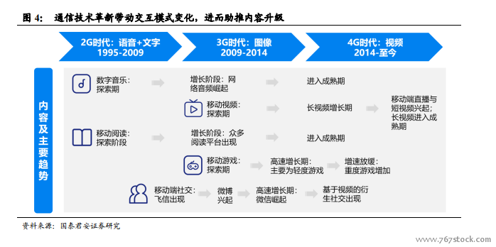 网络基建升级促使传媒内容形态革故鼎新。2G-3G 和 3G-4G 两次通信技术变革带动交互模式变化,进而助推内容升级。2G 时代,互联网兴起,用户主要集中于 PC 端和电视端,在移动端交互仅限于语音和文字,这一阶段数字阅读、页游和端游、数字音乐诞生,人们的社交方式主要集中在手机语音通话和短信,2G 后期中国移动推出的飞信由于融合语音和短信获得快速发展,观看视频的途径也局限于电视端。3G 技术带动移动互联网渗透率不断攀升,网速的提升以及移动端的便捷性促使用户逐渐向移动端转移,数字音乐、数字阅读和页游端游迎来蓬勃发展,此外移动电台、手游、移动视频和以微信为代表的移动社交逐渐兴起。4G 时代视频化趋势明显,得益于传输速度的快速增长,用户在移动端的交互在文字、语音、图片之上新增加视频方式,重度形态手游逐渐兴起、直播和长短视频在 4G 时代快速发展,以陌陌为代表的社交+视频直播的新型社交方式受众广泛。