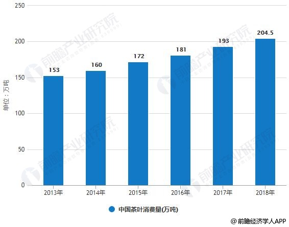 相较于持续增长的茶产量,茶叶销量却显得不太乐观。2017年中国茶叶消费量约为193万吨,消费量稳步增长。2013-2017年,国内茶叶消费量年均复合增长率为6.0%,预计2018年中国茶叶消费量将达到204.5万吨左右。