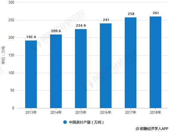 中国茶行业产量已经维持十年连续增长,产大于销仍是突出问题。中国是全球最大的茶叶生产国,同时也是全球唯一生产绿、红、青、黑、白、黄六大茶类的国家。据前瞻产业研究院发布的《中国茶叶行业产销需求与投资预测分析报告》统计数据显示,在国内市场,由于茶园面积稳中增长,湖北、贵州、陕西、江西等省在2017年种植面积分别增加23.6万亩、21.5万亩、19.3万亩、15万亩,2013年中国茶叶产量已达192.4万吨,并呈现逐年增长态势,截止至2017年中国茶叶产量增长至258万吨,2013-2017年,国内茶叶产量年均复合增长率分别为7.6%。进入2018年底中国茶叶产量达到了261万吨,跃居世界第一,占全球产量的45%。