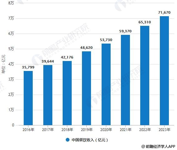 据前瞻产业研究院发布的《中国餐饮行业发展前景与投资预测分析报告》统计数据显示,2016年全国餐饮收入为35799亿元,同比增长10.8%。到了2017年全国餐饮收入增长至39644亿元,同比增长10.7%。截止至2018年底中国餐饮收入突破了4万亿元,达到了42716亿元,同比增长9.5%。预测2019年中国餐饮收入将达48620亿元左右。并预测在2023年中国餐饮收入将增长至突破7万亿元,达到了71670亿元,2019-2023年均复合增长率约为10.19%。