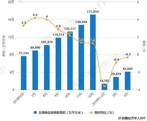 全国商品房销售面积下降 ,商品房销售额增速提高。据前瞻产业研究院发布的《中国房地产行业市场需求预测与投资战略规划分析报告》统计数据显示,2019年1-4月全国商品房销售面积达到42085万平方米,同比下降0.3%,降幅比1-3月份收窄0.6个百分点。其中,住宅销售面积增长0.4%,办公楼销售面积下降12.4%,商业营业用房销售面积下降8.8%。