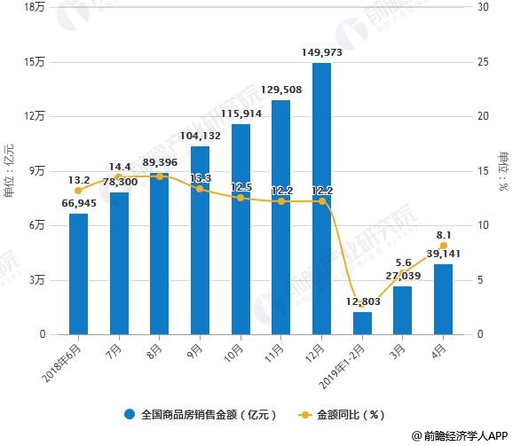 2018-2019年4月全国商品房销售面积、销售金额统计及增长情况