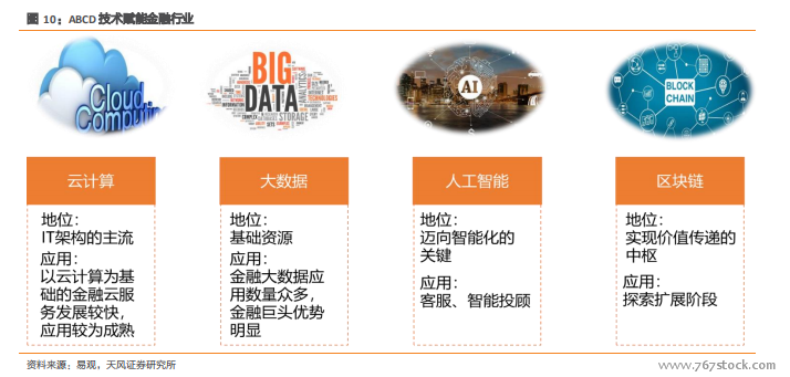 从金融行业对科技的应用来看,金融科技的发展历程可以分为三个阶段。第一阶段:金融电子化时期(1993 年-2004 年)。1993 年,国务院发布《有关金融体制改革的决定》,明确指出要加快金融电子化建设。中国人民银行和银行业金融机构开始探索行业电子化建设之路,通过构建自身的 IT 系统, 来实现办公和业务的电子化、自动化。2001 年之后,金融机构在利用现代通信网络技术的基础上,更加注重数据库技术的应用,将数据逐步集中汇总,提升服务和管理水平。代表性应用包括 ATM、POS 机、银行的核心交易系统、信贷系统、清算系统等。第二阶段:互联网金融时期(2004 年-2016 年)。互联网金融时期呈现的特点是金融机构或互联网公司搭建在线业务平台,汇集海量用户,利用移动互联网技术对传统金融服务进行变革,对接金融的资产端、交易端、支付端和资金端,实现渠道网络化。如网上证券开户、网银系统、P2P、移动支付等。第三阶段:金融科技时期(2016 年至今)。与互联网金融时期不同的是,金融科技的范围更广。除了互联网技术,更多新兴技术如大数据、云计算、人工智能、区块链被融合到金融业务中,传统金融企业、金融行业的新进入者和科技类企业利用科技手段对传统金融产品和服务进行变革或催生新的金融产品或服务,降低交易成本、提升运营效率。代表性应用除互联网金融时期的应用外,还包括大数据征信、智能投顾、供应链金融等。
