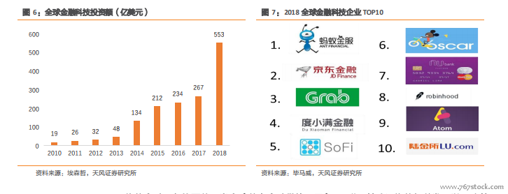 全球金融科技投资高涨,中国金融科技后来居上。根据埃森哲的调查,2018 年全球金融科技投资增长逾一倍,达到 553 亿美元。其中中国投资额达 255 亿美元(同比增长 9 倍),占据全球总投资额的半壁江山(46%),几乎相当于2017 年全球金融科技投资额(267 亿美元)。2018 年 5 月,蚂蚁金服获得 140 亿美元融资,占中国金融科技投资额一半以上,是 2018 年全球融资额最高的企业;排名第二为中国的度小满金融,该公司于 4 月份从百度中分拆出来,通过两次单独交易筹集了 43 亿美元以支持其消费金融业务。今年 3 月,中国平安在其 2018 年度业绩报告中披露,旗下陆金所已完成 C 轮融资,融资额超过 13 亿美元,参投机构包括卡塔尔投资局、春华资本、麦格理资本、软银集团等全球知名机构、国家主权基金、知名私募等,投后估值达 394 亿美元。