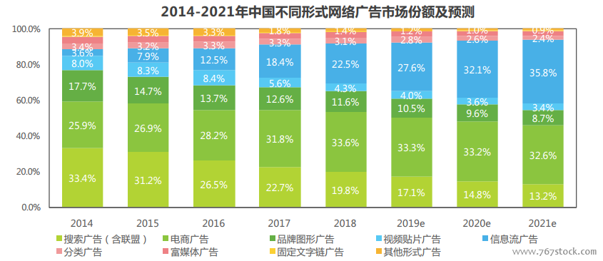 未来5年内,网络广告诸多广告形式或将逐渐呈现信息流化。2018年,中国网络广告在细分领域市场份额变化仍在继续,传统搜索广告整体发展低于行业水平,份额持续降低;电商广告占比33.6%,与去年同期相比,份额持续上升。信息流广告表现仍旧突出,2018年信息流广告口径除包含社交、新闻、视频等之外,计入了以搜索等工具类平台及短视频平台为主要载体的信息流广告,其市场份额达到22.5%,份额增加明显,并跃居第二位。艾瑞咨询认为未来5年内,网络广告的诸多广告形式将会逐渐呈现信息流化。