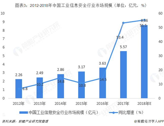 在政策的不断利好下,我国工业信息安全行业市场规模不断扩大。据《中国工业信息安全产业发展白皮书》显示,2017年,我国工业信息安全市场规模同比增长53.6%,达到5.57亿。近两年我国工业信息安全市场规模都以超过50%的增速迅速发展,我国工业信息安全产业发展驶入快车道。