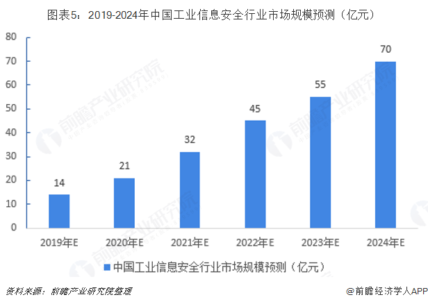 所以工业信息安全行业属于国家重点鼓励发展的行业,为此国务院出台了相关政策从投融资、税收、产业技术、出口、收入分配、人才吸引与培养、采购和知识产权保护等多方面对相关企业给予支持。根据近年中国工业信息安全行业市场规模的增长趋势,前瞻预测,行业规模扔家持续扩大,到2024年,中国工业信息安全行业市场规模有望达到70亿元。