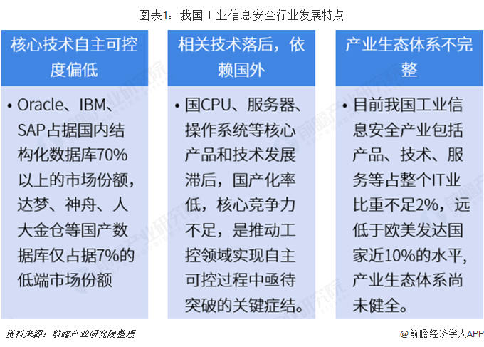 当前,我国工业信息安全行业发展具有三大特点,分别是核心技术自主可控度偏低、相关技术落后,依赖国外以及产业生态体系不完整。目前我国各个行业、各个领城的重要工控系统大量采购国外技术和设备,受制于人的局面尚未得到根本改变。根据我国近几年重点领域信息安全检查工作统计,数千个工控系统由国外厂商提供运行维护,大量工业企业不具备自主维护能力,系统运行的可控能力较低,同时缺乏对国外产品和服务的监管,缺少必要的技术检测措施和安全可控方案,风险难以掌握。